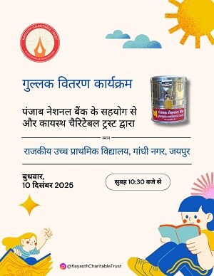 राजकीय उच्च प्राथमिक विद्यालय गांधीनगर जयपुर में कायस्थ चैरिटेबल ट्रस्ट के सहयोग से पंजाब नेशनल बैंक मंडल कार्यालय जयपुर अजमेर द्वारा विद्यालय के विद्यार्थियों को गुल्लक पिगी बैंक वितरित किए गए, जिसके द्वारा बच्चों में बचत की भावना विकसित हो एवं वे बचत व वित्तीय साक्षरता के प्रति जागरूक हों। कायस्थ चैरिटेबल ट्रस्ट के अध्यक्ष श्री अम्बरीश सक्सेना ने बताया कि यह गुल्लक सभी विद्यार्थियों को दिए जा रहे हैं ताकि सभी विद्यार्थी प्रतिदिन ₹5 से शुरुआत कर रोजाना थोड़े-थोड़े पैसे जमा करें एवं महीने के अंत में जब अच्छी जमा राशि एकत्रित हो जाए तो बैंक में भी अपने खाते खुलवाए ताकि जब वे 18 वर्ष के हों तो उनको एक अच्छी जमा राशि प्राप्त हो सके। इस अवसर पर पंजाब नेशनल के उपमंडल प्रमुख श्री अनिल कुमार ने विद्यालय के विद्यार्थियों को बैंक में खाता खोलने एवं वहां के स्टाफ सदस्यों को बैंक की विभिन्न स्कीमों के बारे में बताया तथा पंजाब नेशनल बैंक में खाता खुलवाने की अपील की । इस अवसर पर कायस्थ चैरिटेबल ट्रस्ट की सदस्य श्रीमती साधना सक्सेना, श्रीमती कल्पना सक्सेना एवं कुलदीप जी,पंजाब नेशनल बैंक मंडल कार्यालय जयपुर अजमेर की प्रबंधक राजभाषा डॉ.ममता मीना , खादी बोर्ड शाखा के अधिकारी श्री राकेश कुमार उपस्थित रहे। विद्यालय की प्राचार्य श्री रेखा वर्मा जी ने सभी को धन्यवाद ज्ञापित किया।